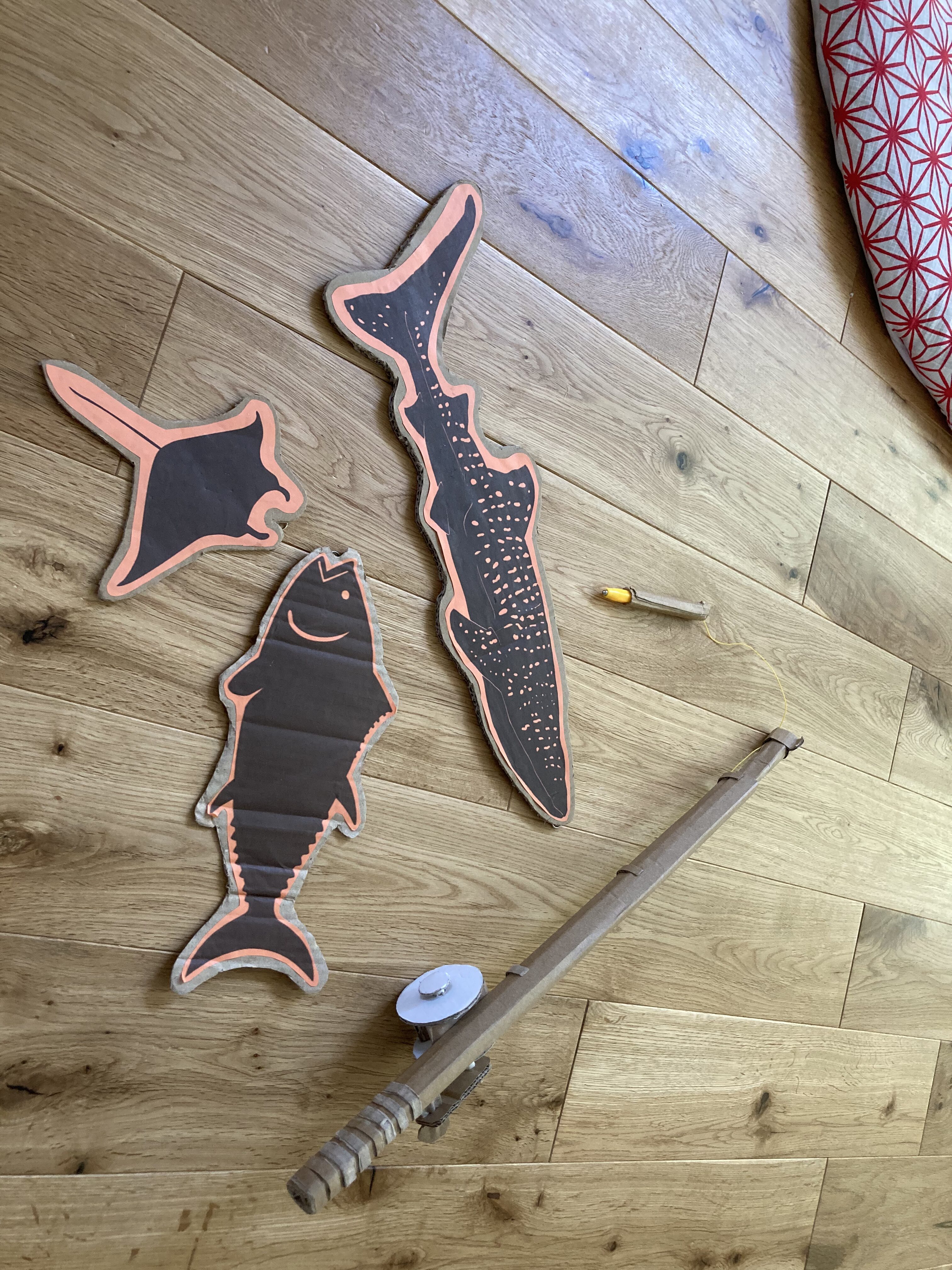 段ボールに貼り付けて、リアルな魚影が完成しました。ネタとして、魚以外も用意(笑)