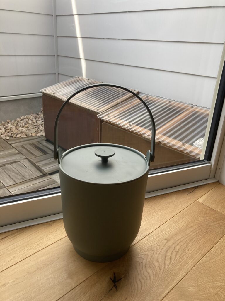 コンポストを使うとき、生ゴミを一時的に置く容器に困ることがありますが、このゴミ箱ならスムーズ。ふた付きで臭いを抑えつつ、必要なときにサッと移動できます